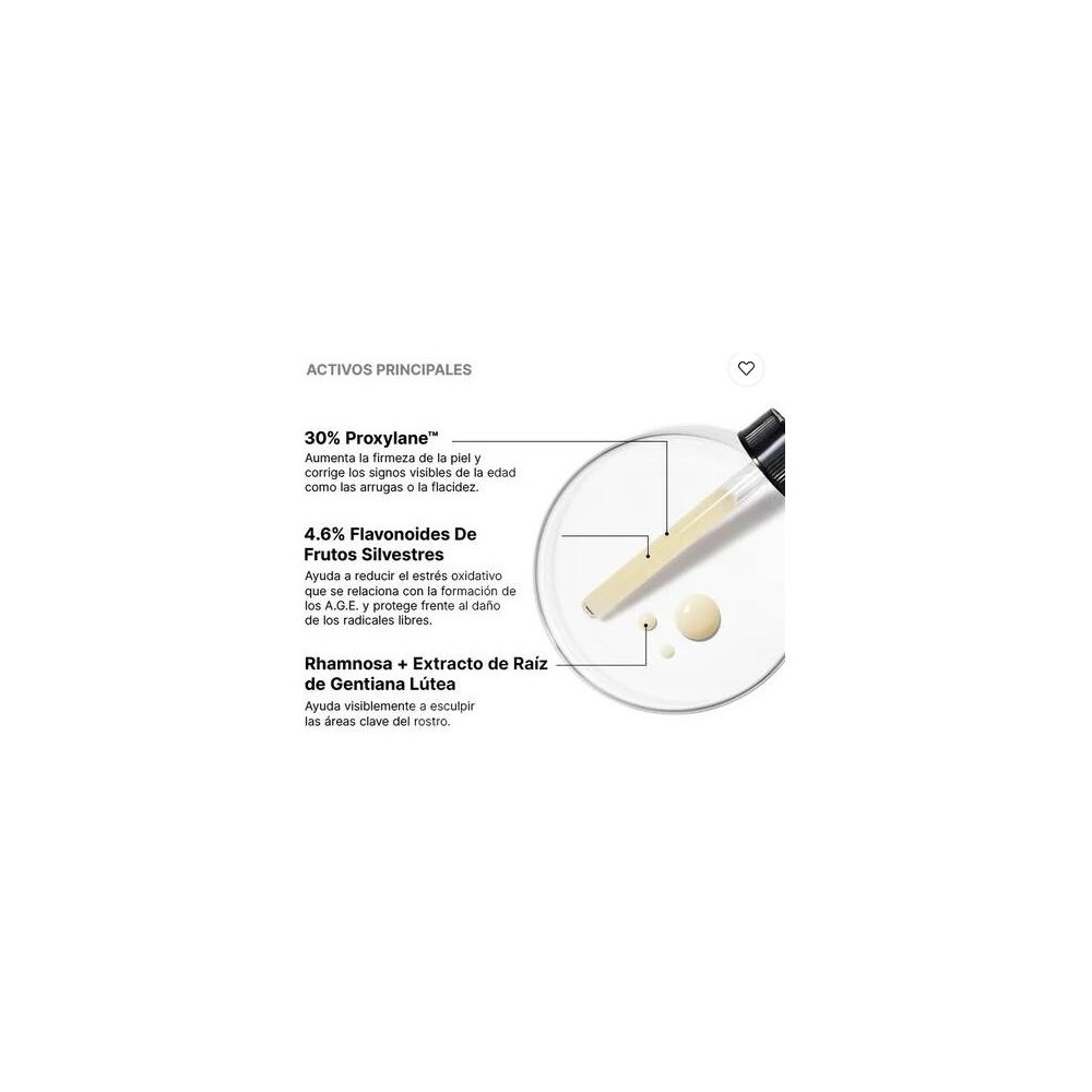 Un sérum remodelador intensivo con efecto lifting, doble patentado, que reafirma y tensa visiblemente 4 zonas clave del rostro: cuello, mandíbula, mejillas y frente, para conseguir un aspecto más esculpido. La fórmula de este sérum reafirmante contiene una alta concentración de 34,6% de Flavo-Proxylane para ayudar a reducir visiblemente los signos de envejecimiento causados por la disminución del colágeno y la glicación, incluidas las arrugas y la laxitud. A.G.E. Interrupter Ultra Serum también está formulado con una combinación sinérgica de activos como la Ramnosa y el Extracto de Raíz de Gentiana Lutea para ayudar a maximizar los resultados de lifting y esculpido facial. Probado en todo tipo y tono de piel.