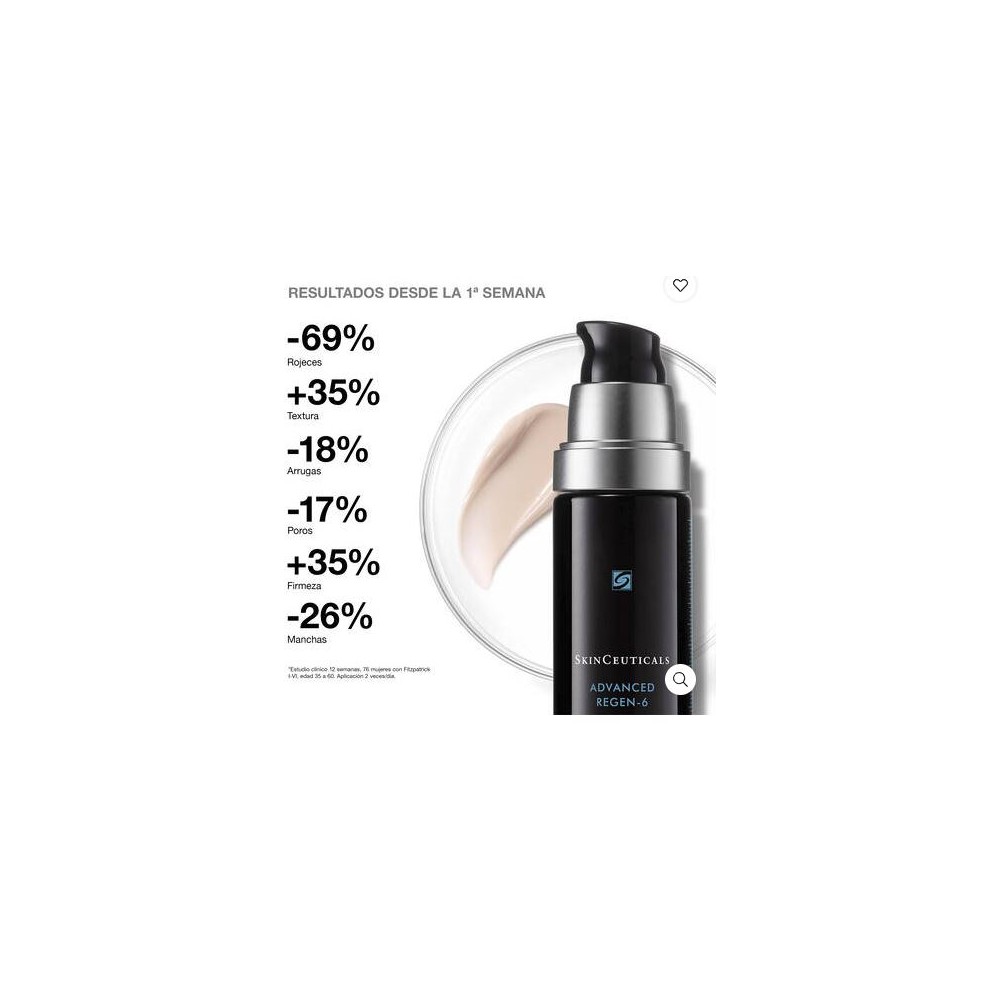 Advanced Regen 6- una crema antiedad, inspirada en la ciencia de regeneración global del laser, que corrige visiblemente desde la primera semana las 6 dimensiones del envejecimiento. Esta fórmula con textura patentada es ideal tanto para uso diario como postratamiento. Presenta un efecto antiedad global que actúa sobre arrugas, manchas, textura, firmeza poros, y rojeces, como un laser.